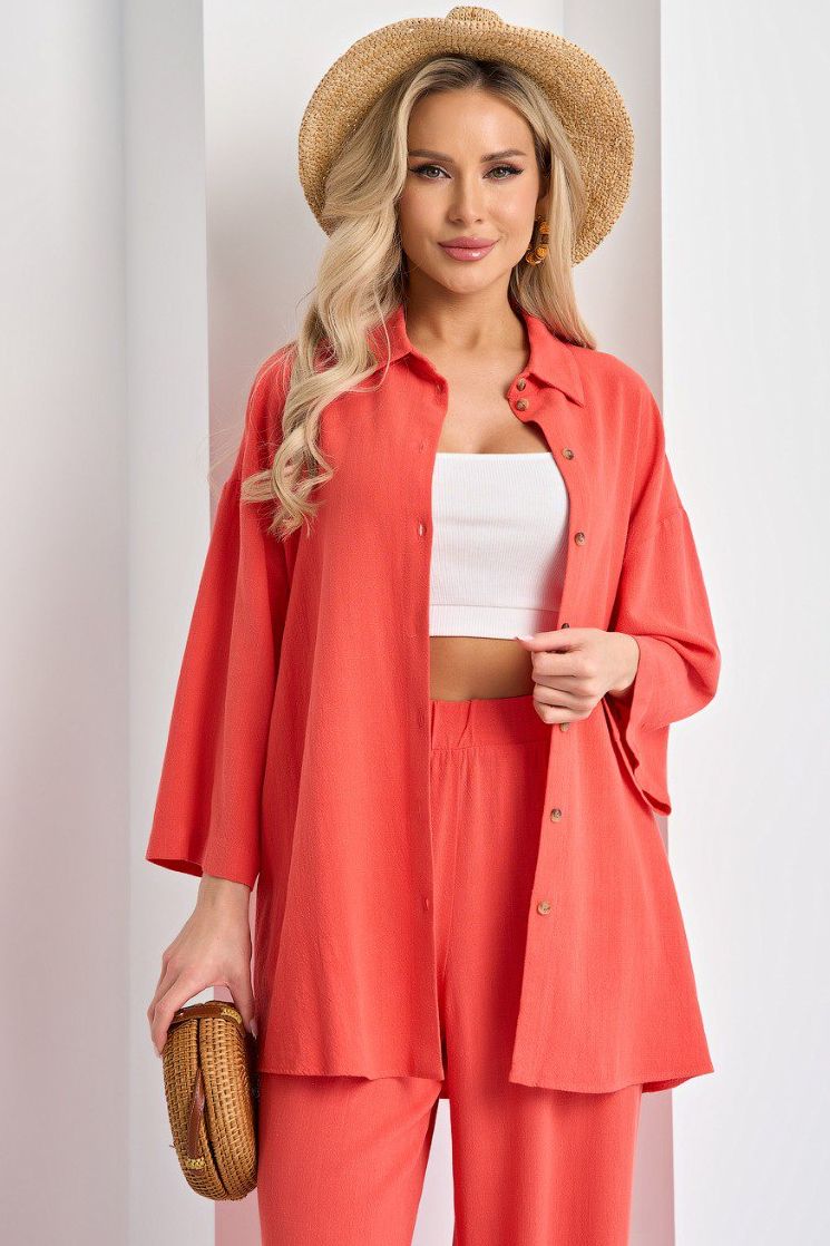 Рубашка льняная кораллового цвета от бренда Jetty. Модель свободного силуэта, воротник рубашечного типа. Широкий рукав 3/4 с широкой подгибкой, с отложным воротничком рубашечного типа.Ткань усадочная, садится после стрики, степень усадки заложена при крое. Прекрасный выбор для повседневной носки.