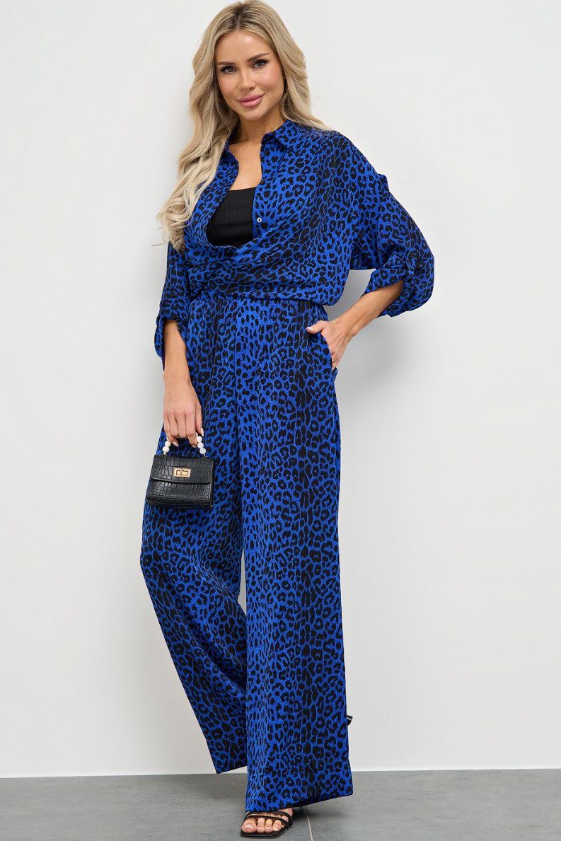 Брюки широкие синие с карманами от производителя Jetty, выполнены из плательного полотна с леопардовым принтом. Притачной пояс на резинке. Без подклада и застёжек. По низу широкая подгибка. Отличный выбор для создания повседневного образа.