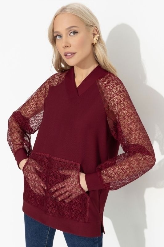 Свитшот трикотажный бордовый с рукавами из кружева от компании Charutti. Модель полуприлегающего силуэта, выполнена из ткани "оттоман". V-образный вырез горловины. Втачные длинные рукава на манжетах. Карман оформлен нежным кружевом. Низ ровный, по бокам разрезы. Модный образ для встречи с друзьями.