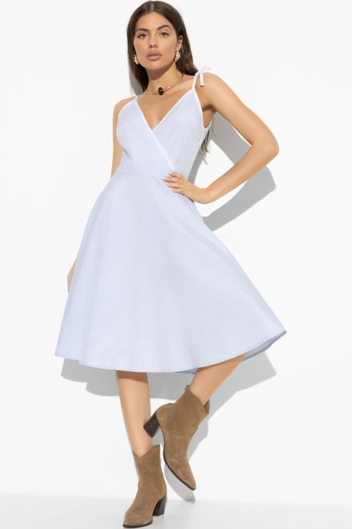 Сарафан голубой с карманами от компании Charutti. Модель полуприлегающего силуэта, выполнена из льна "тайвань". V-образный вырез горловины на запах. Без рукавов на тонких регулируемых бретелях. Отрезное по линии талии. Идеальный выбор для Вашего летнего гардероба.