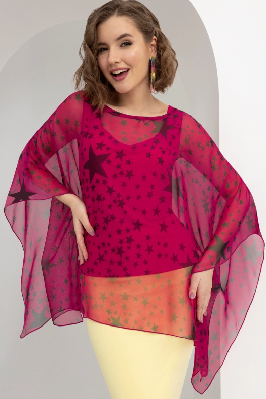 Оригинальная женская туника от компании Charutti. Модель свободного силуэта, выполнена из шифона и трикотажа "масло". Круглый вырез горловины. Цельнокроеные рукава длиной 3/4. Идеальный выбор для летнего сезона.