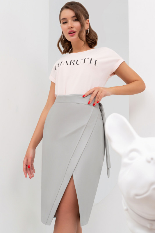 Эффектная женская юбка от компании Charutti. Модель полуприлегающего силуэта на запах, выполнена из эко-кожи. Притачной пояс с завязками. Идеальный выбор для создания повседневного образа.